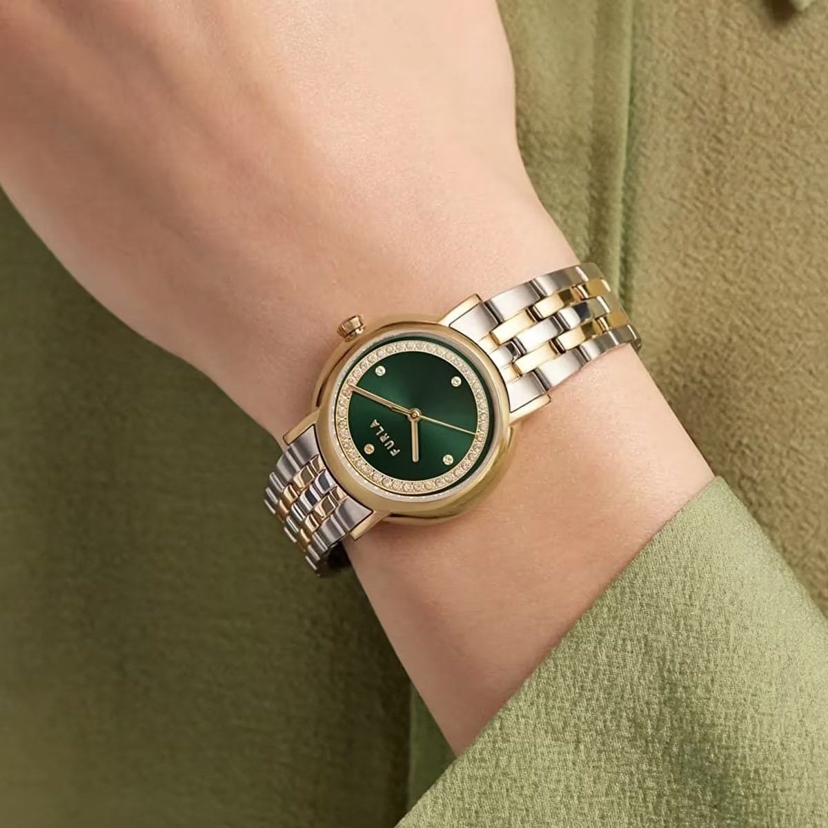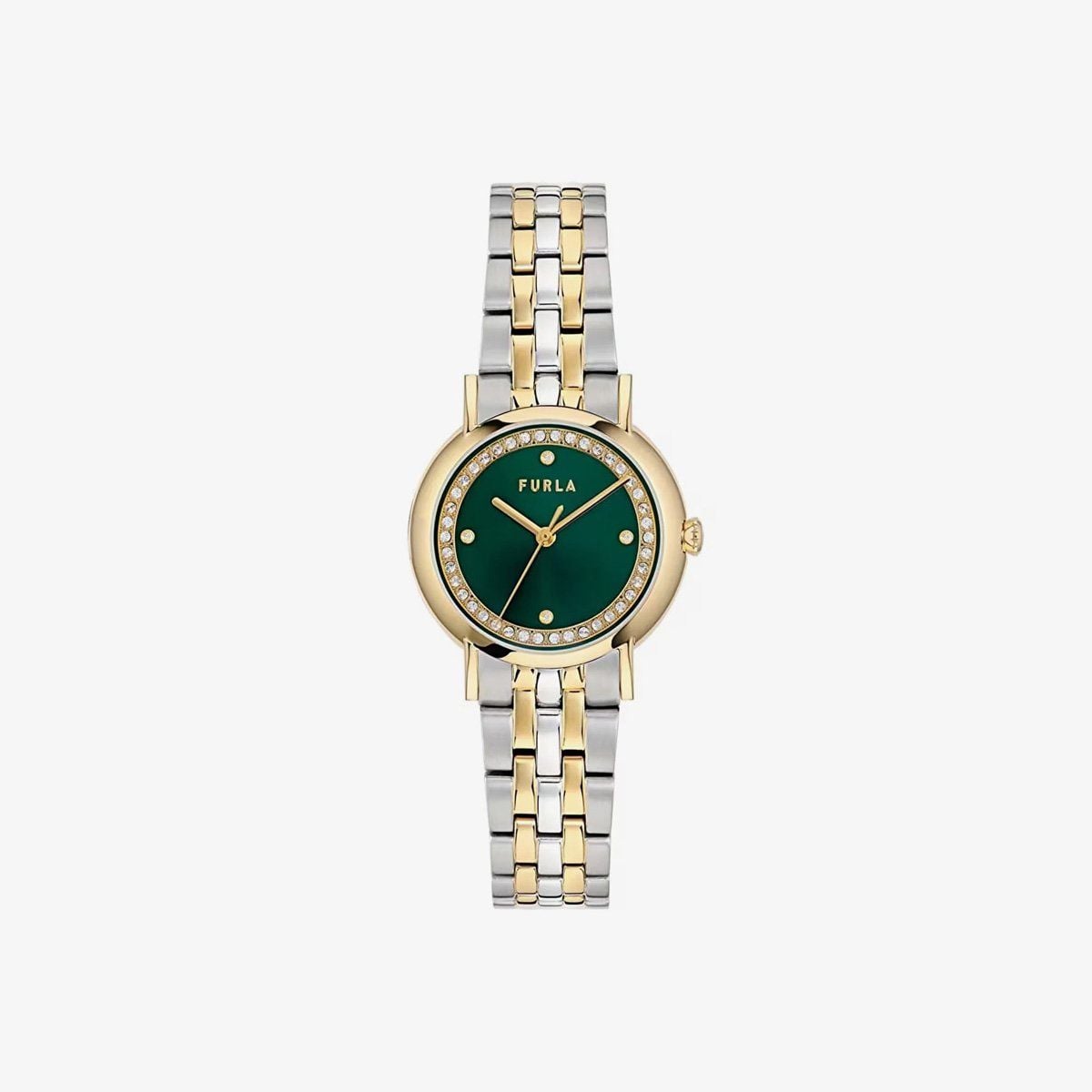 • Mặt số: Tròn, màu xanh lá, vỏ bằng thép không gỉ màu vàng