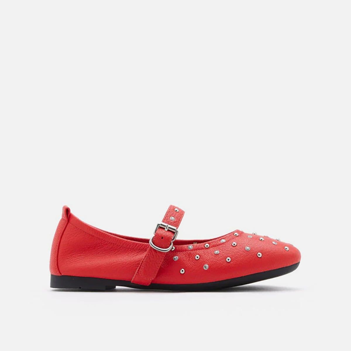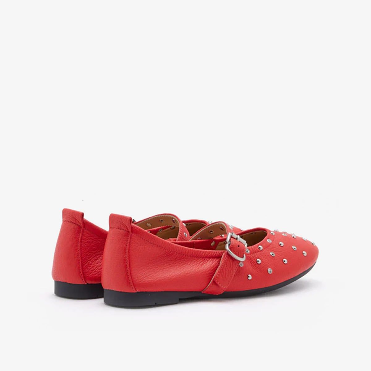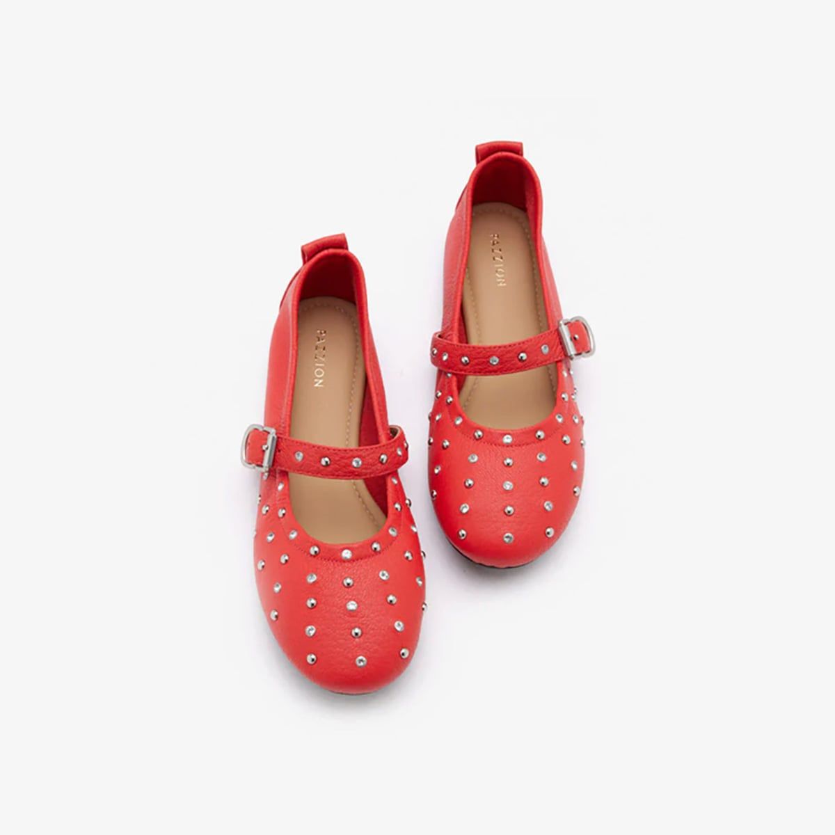 Giày Mary Jane PAZZION (9558-60) RED - Lấy cảm hứng từ vẻ thanh thoát của những đôi giày truyền thống Nhật Bản, đôi ballet flats đặc trưng này được chế tác từ da cừu mềm mại với mũi tròn duyên dáng và quai cài tinh tế, mang đến sự vững chãi nhờ đế cao su tiện dụng. Phần thân giày và quai được điểm xuyết bằng các đinh tán pha lê lấp lánh cùng chi tiết kim loại ánh bạc, tạo nên sự hòa quyện hoàn hảo giữa thẩm mỹ và công năng trong một thiết kế tinh xảo.