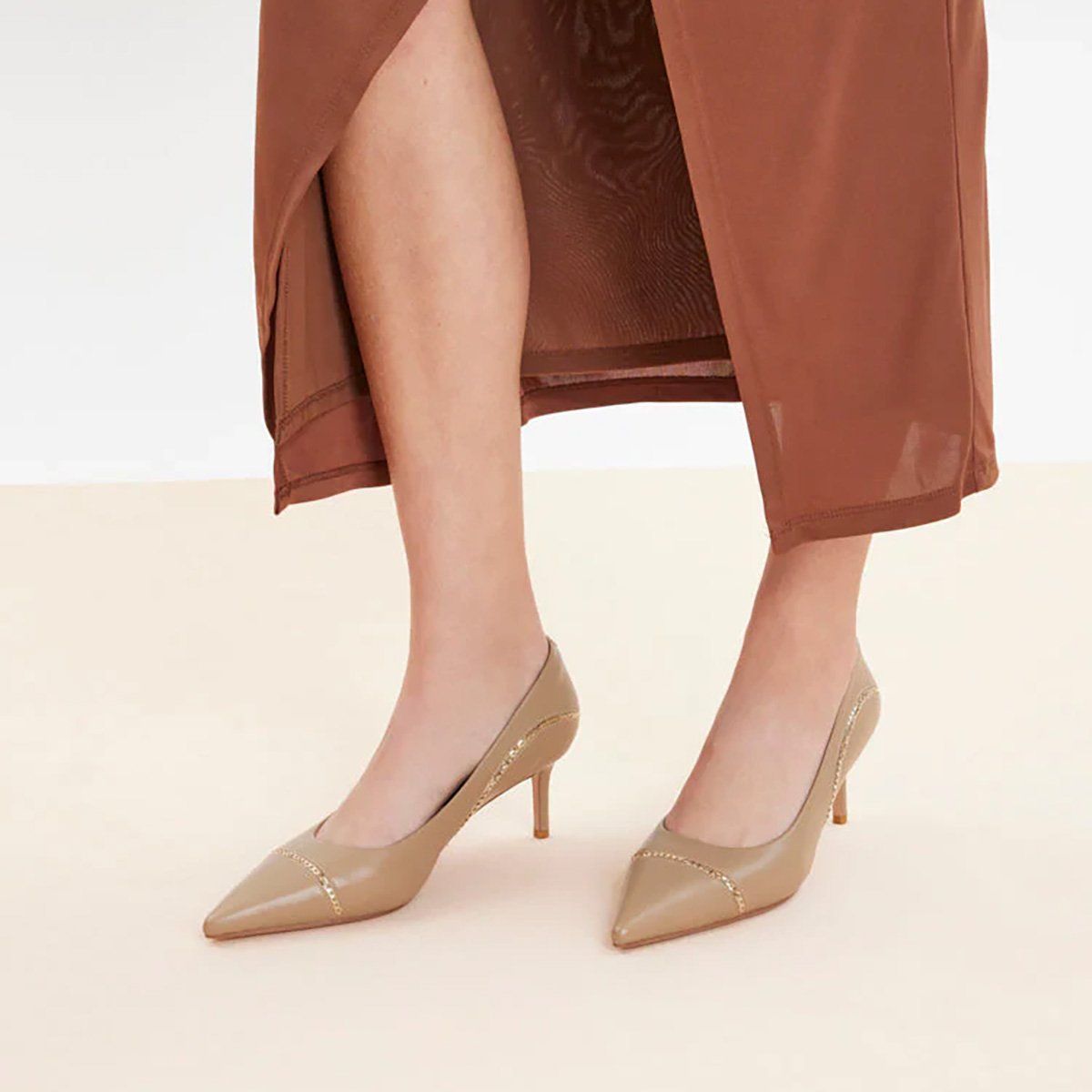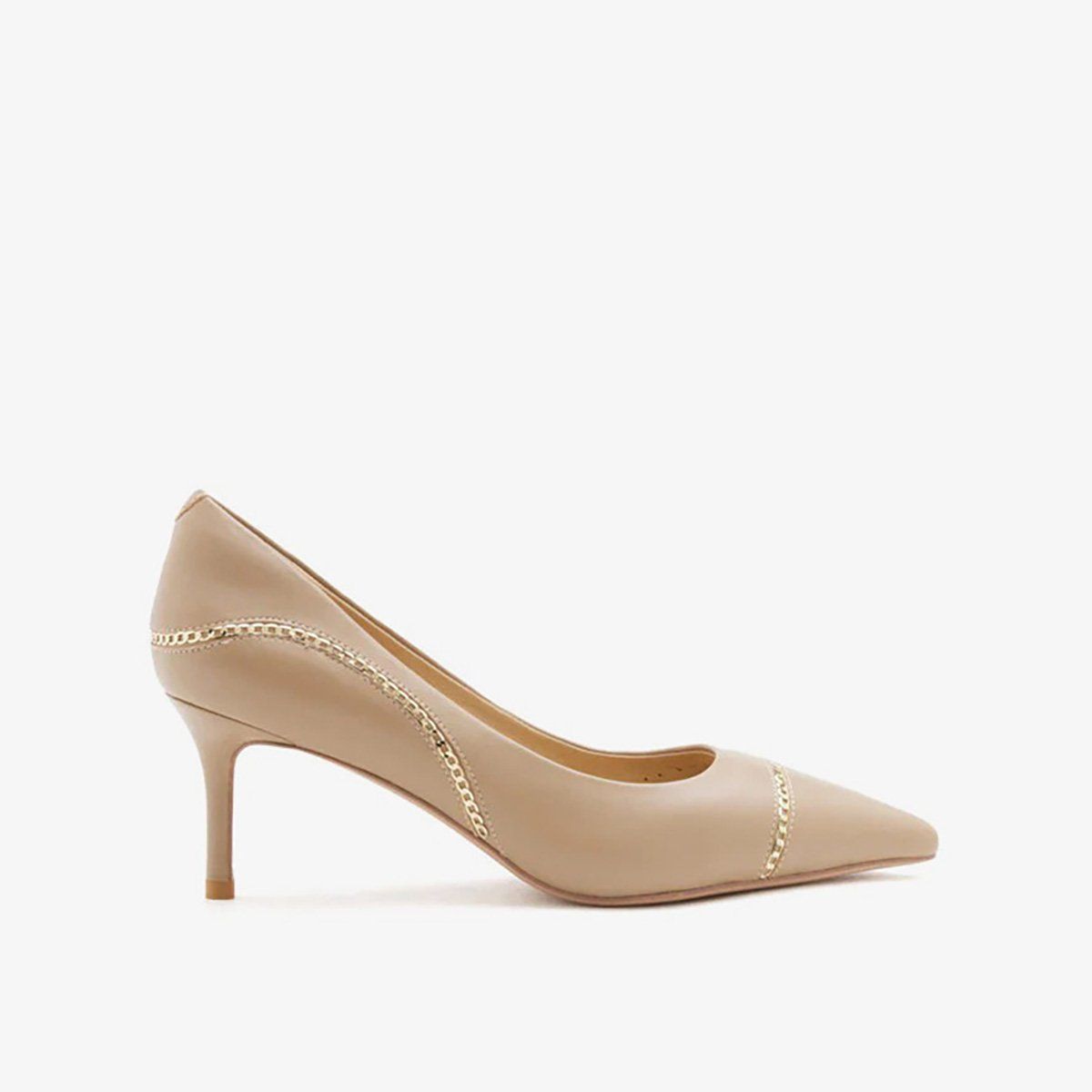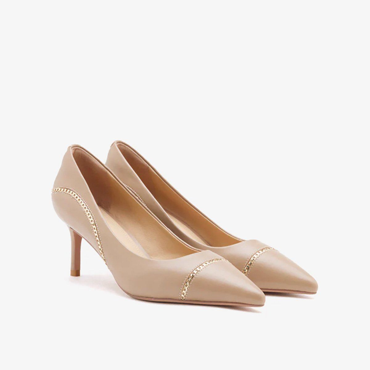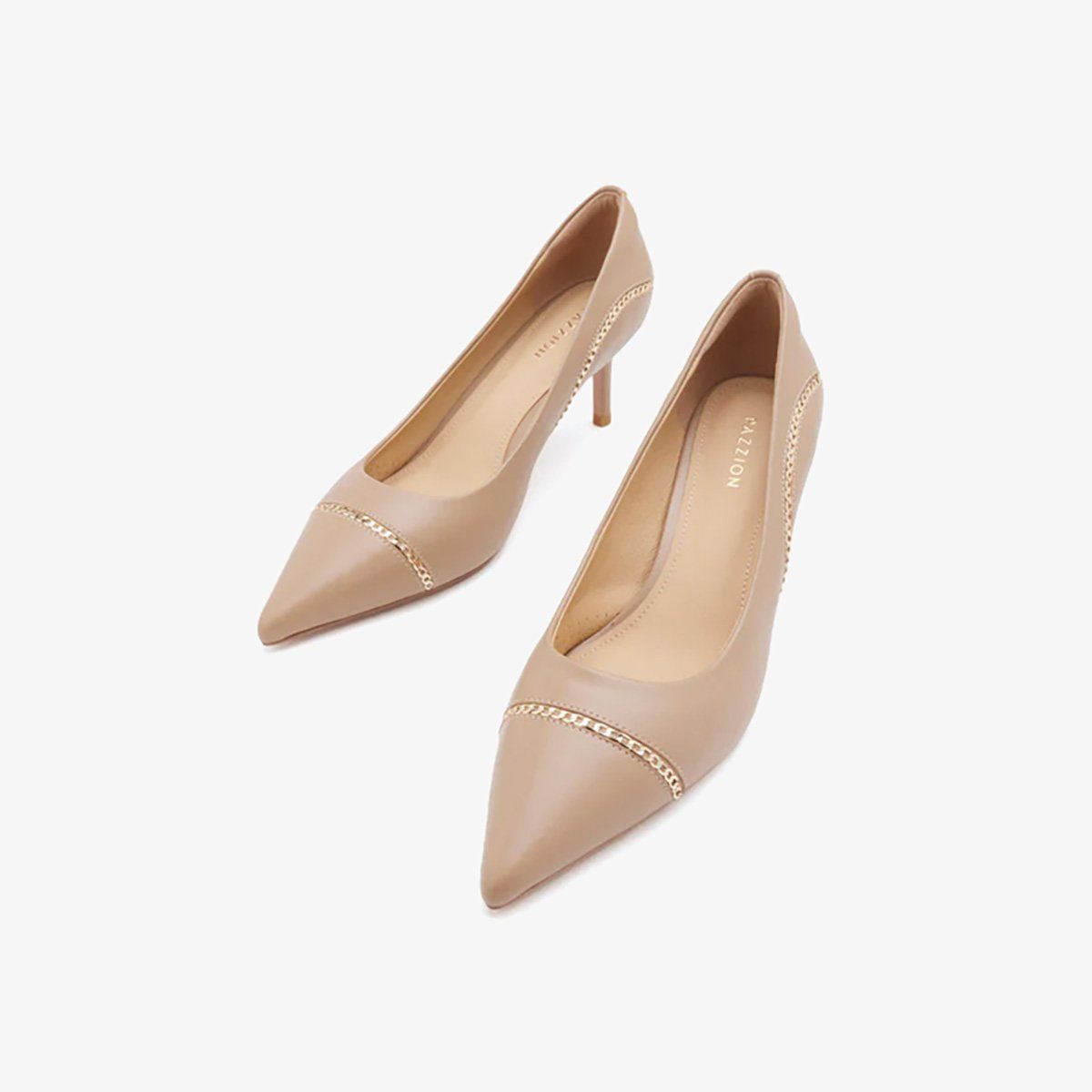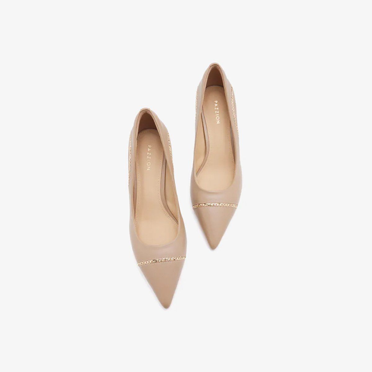 Giày cao gót PAZZION (Y6166-66) ALMOND - Tinh xảo trong từng đường nét, đôi giày cao gót mũi nhọn này được chế tác từ da cừu mềm mại, mang đến cảm giác êm ái như lụa chạm. Điểm nhấn là chi tiết xích vàng tinh tế viền quanh mũi giày.