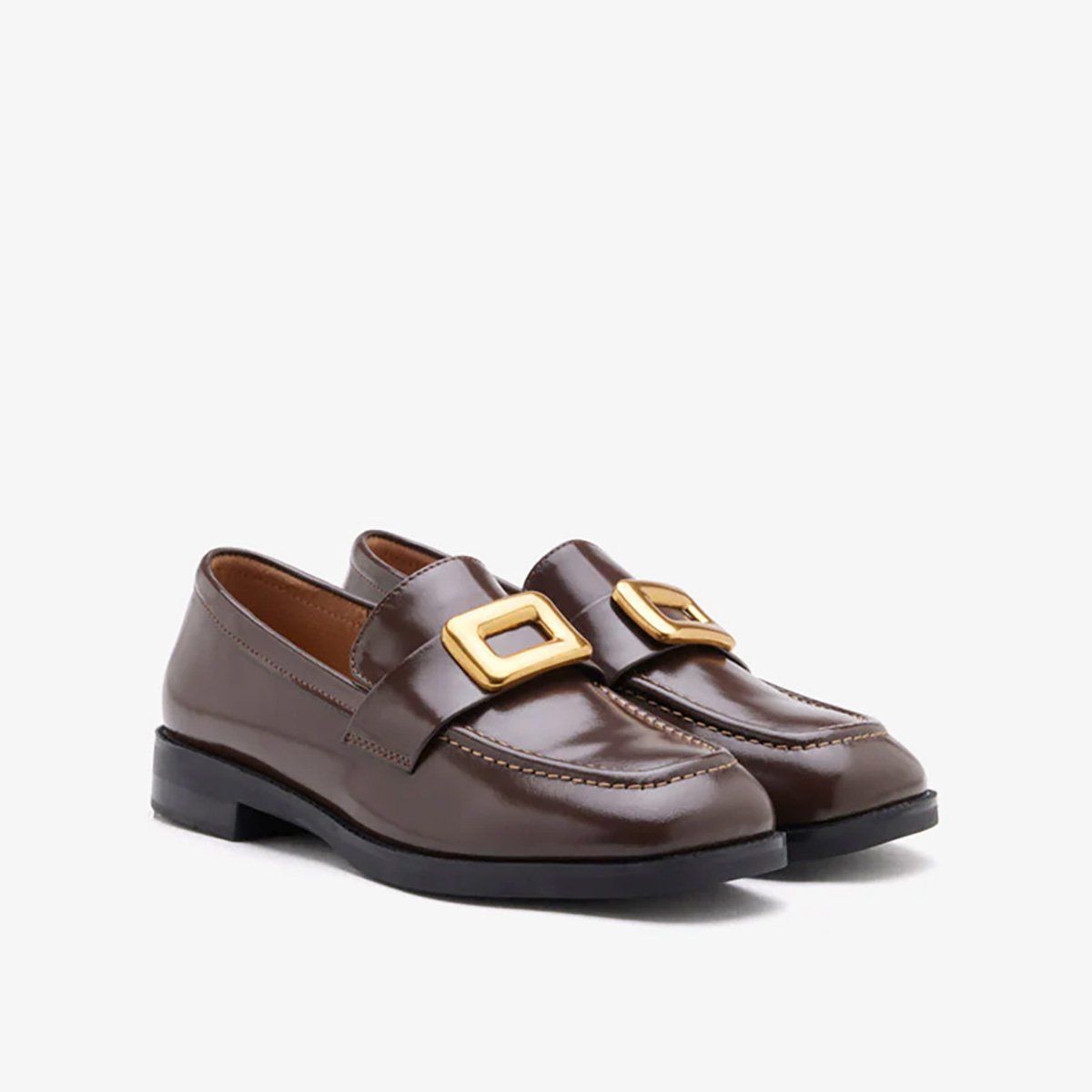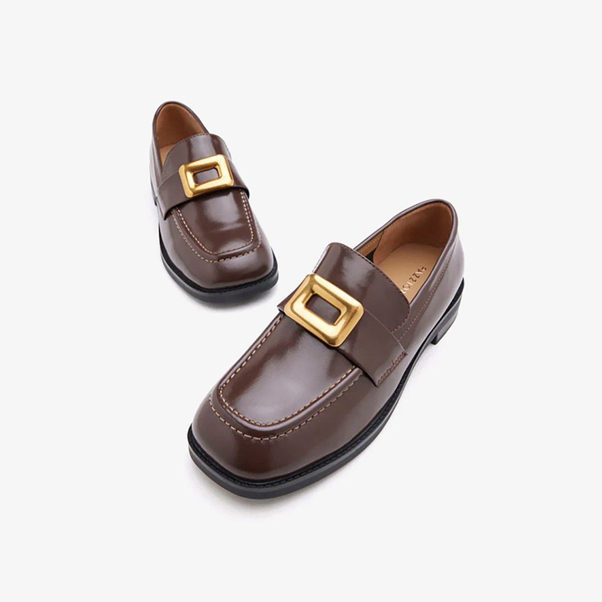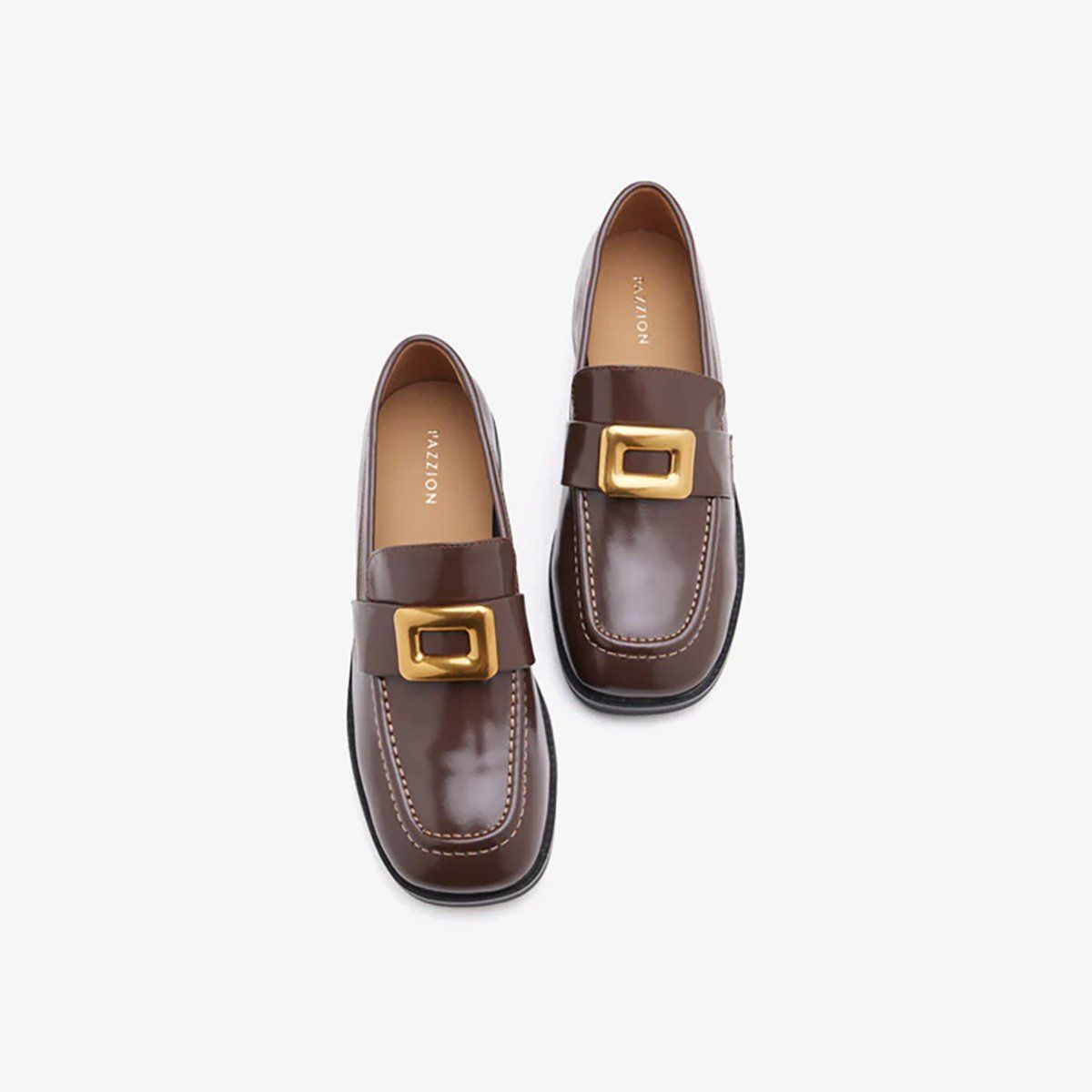 Giày Loafer PAZZION (533-2) DARK BROWN - Sở hữu phom mũi vuông sắc sảo và điểm nhấn khóa vàng bản lớn, đôi loafers này mang đến vẻ đẹp thanh lịch hiện đại, gợi nhớ tinh thần cổ điển tinh tế.