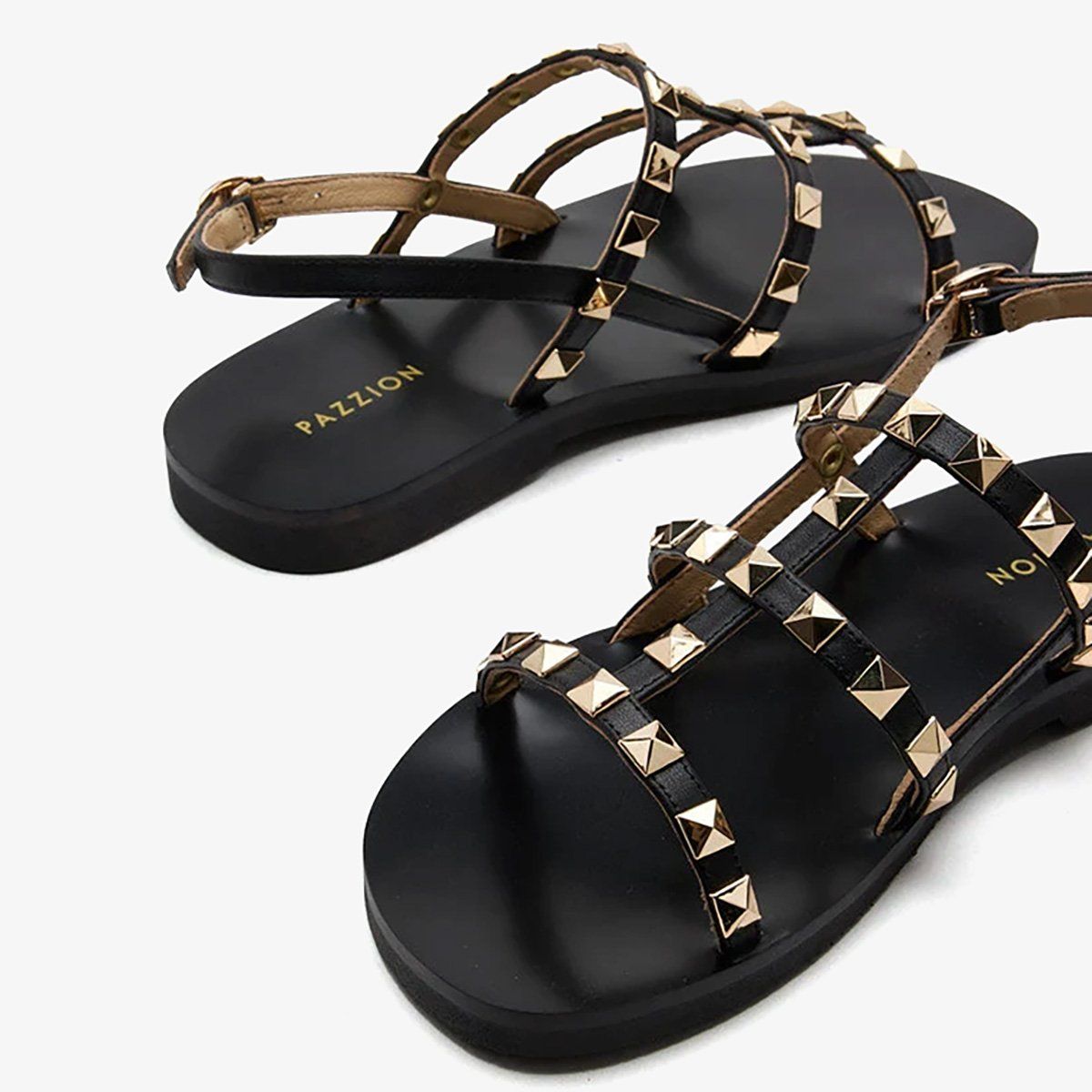 Giày Sandal PAZZION (8998-10) BLACK - Đôi sandal đính đinh tán này là hiện thân của sự giao thoa hoàn hảo giữa nét cá tính nổi loạn và vẻ thanh lịch tinh tế. Được chế tác từ da bò cao cấp, Lớp lót và lót đế bằng da cừu mang đến cảm giác êm ái tuyệt đối, trong khi đế cao su bền bỉ đảm bảo tính linh hoạt cho mọi bước chân.