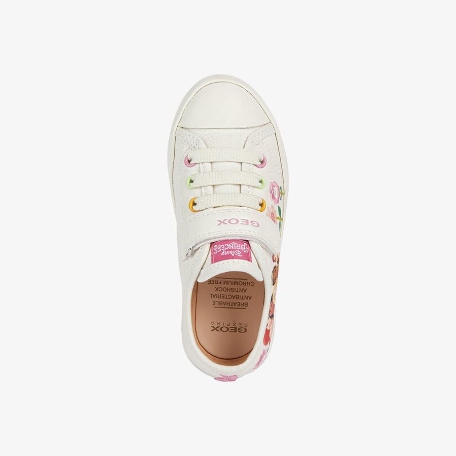 • Giày sneaker cổ thấp thoáng khí hợp xu hướng dành cho bé gái với họa tiết Công chúa Disney. Được làm từ vải canvas màu ngà nhạt, Ciak là sự kết hợp quyến rũ giữa phong cách và sự tinh tế của thời trang, đồng thời có phần trên thoải mái với các chi tiết in, hoa thêu và lỗ xỏ dây nhiều màu. Một sản phẩm của sự hợp tác giữa Geox và Disney, kiểu dáng xinh xắn, dễ Thương cho các công chúa diện các trang phục của mình từ đi chơi, đi học, đi dạo phố hoặc đi du lịch.