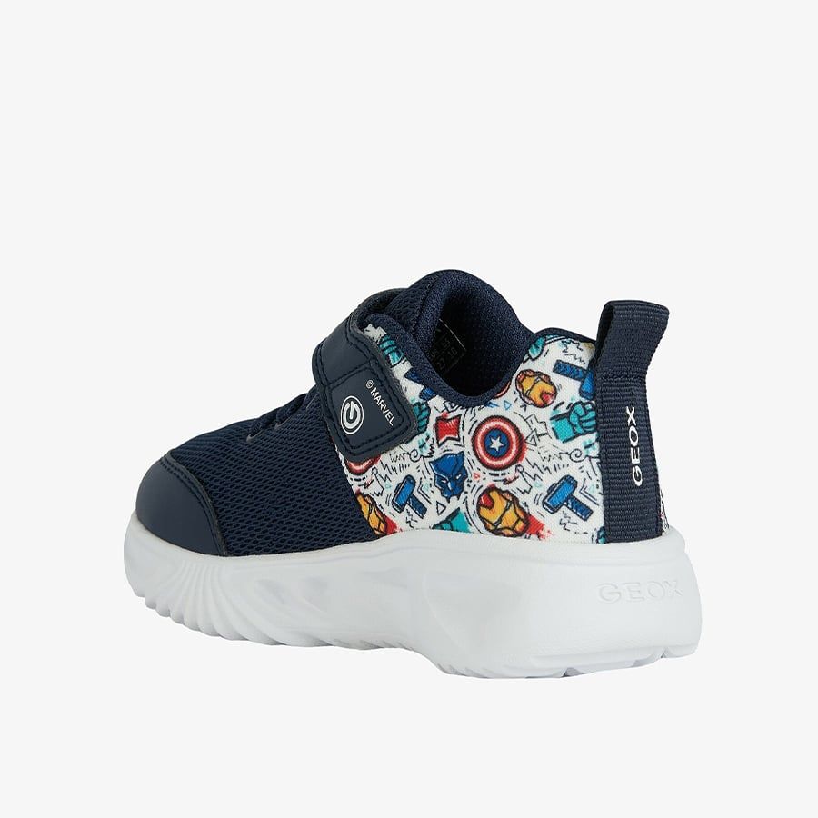 Geox Assister với thiết kế năng động dành cho bé, phần đế trong suốt được tích hợp đèn. Phần thân giày có họa tiết của các nhân vật Marvel, kết hợp với nhiều tông màu tạo nên sự sống động cho đôi giày. Phong cách thể thao năng động giúp bé có thể thoải mái diện đi học hay đi chơi vào cuối tuần.
