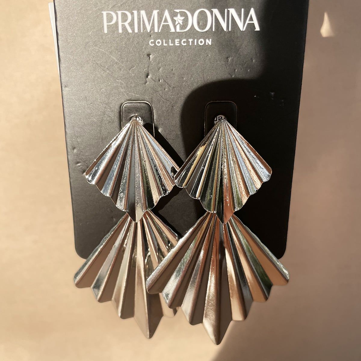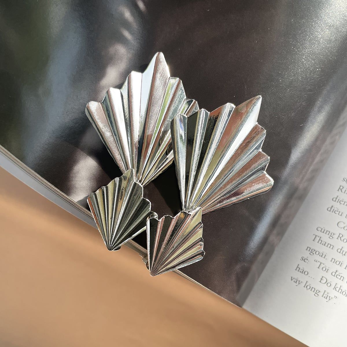 Đậm chất nghệ thuật và đầy cá tính, đôi khuyên tai bản lớn lấy cảm hứng từ những nếp gấp cánh quạt, mang đến hiệu ứng thị giác mạnh mẽ và hiện đại. Bề mặt kim loại ánh bạc được tạo khối góc cạnh, phản chiếu ánh sáng rực rỡ theo từng chuyển động, giúp phụ kiện trở thành tâm điểm trong mọi outfit.
