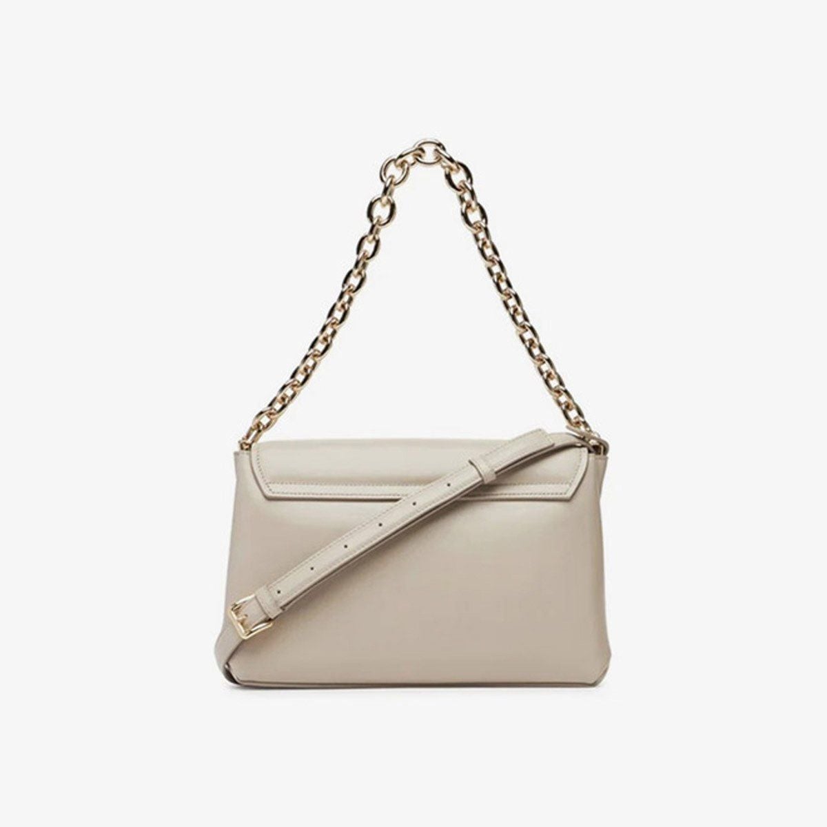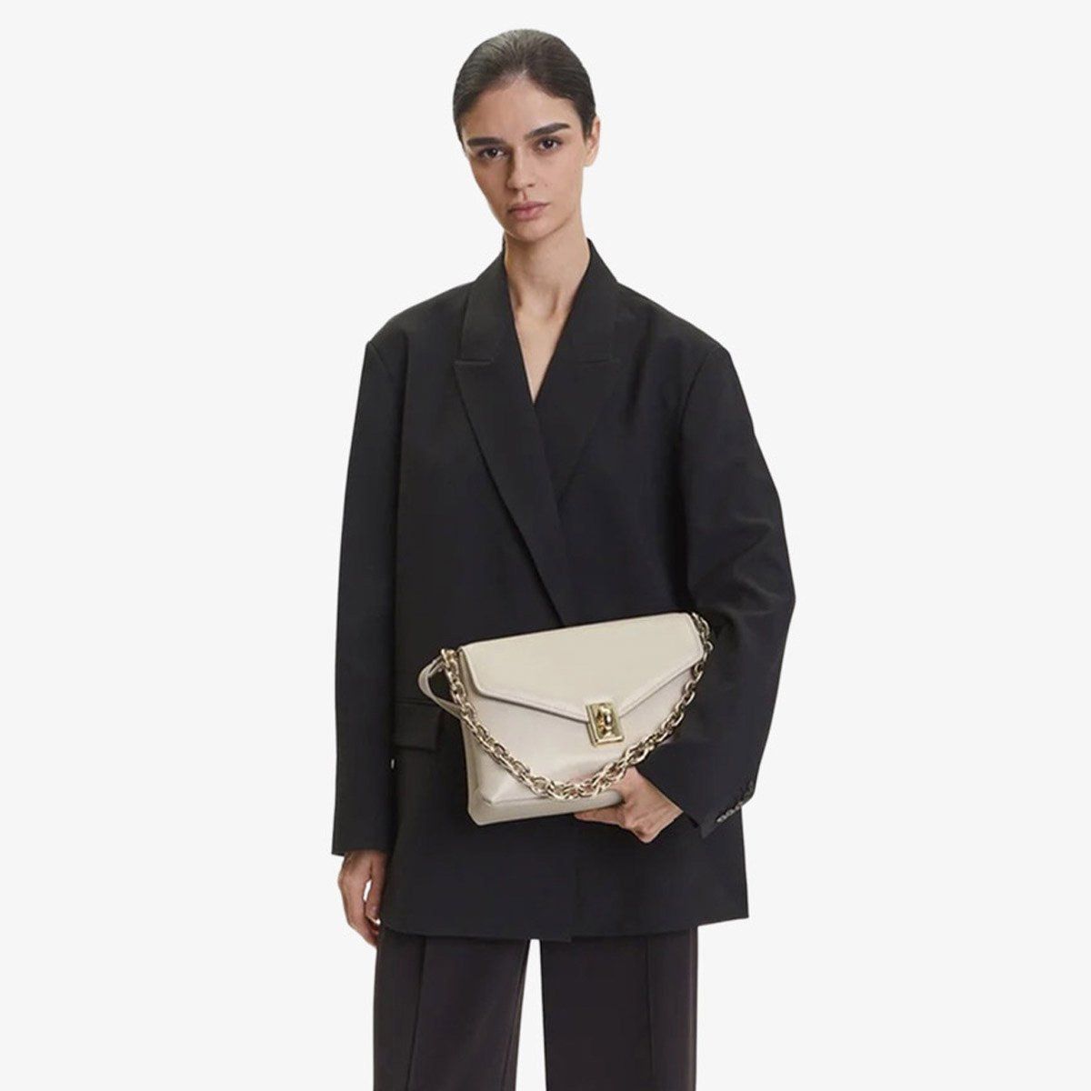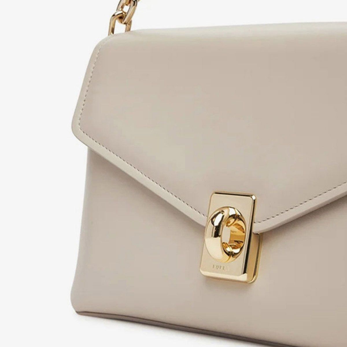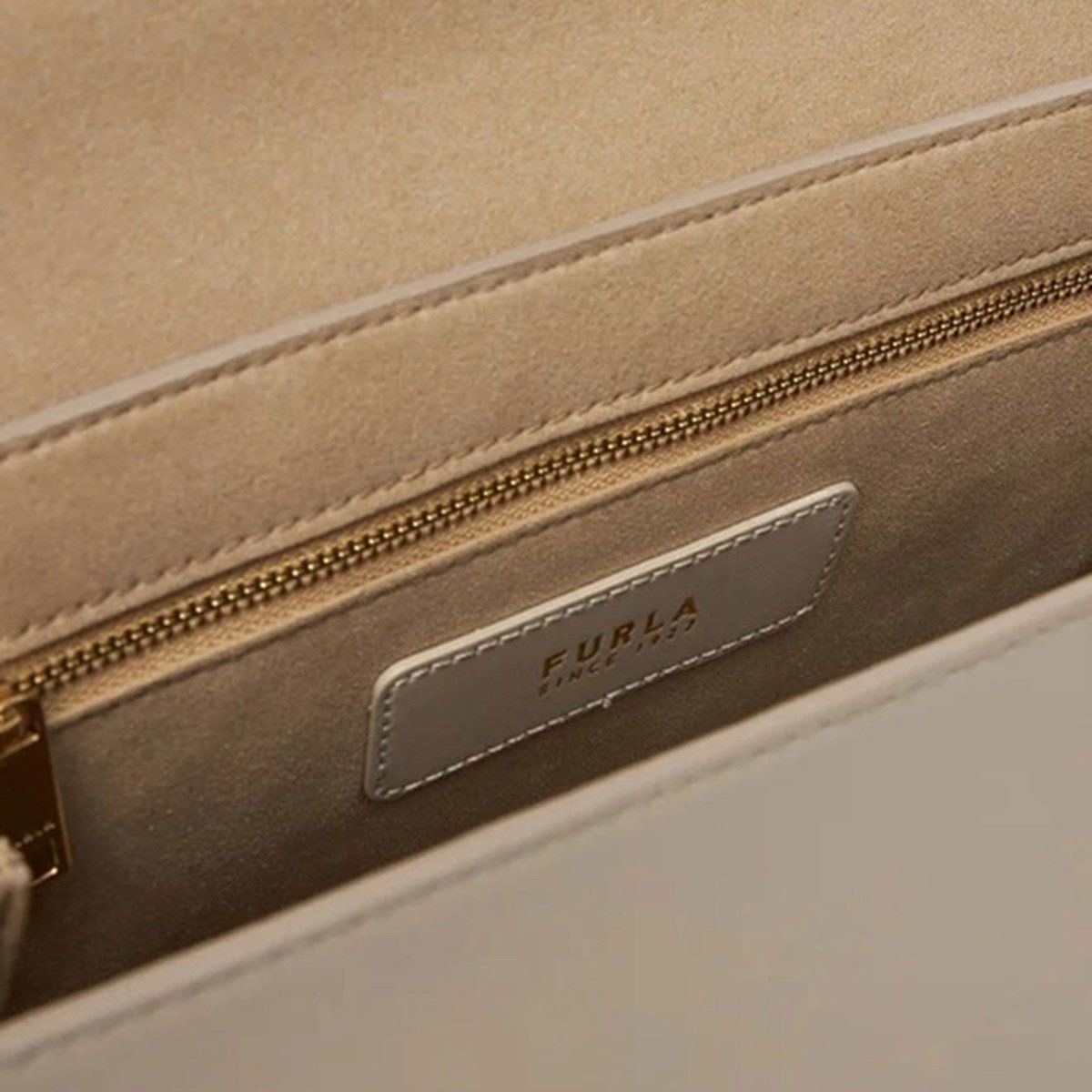 Furla Meridiana gây ấn tượng với phom dáng hình thang hiện đại cùng chi tiết hông xếp nếp tinh tế, tạo nên silhouette mềm mại nhưng đầy cá tính. Được chế tác từ da bê Bologna mềm mịn, túi mang lại cảm giác sang trọng với độ bóng mượt tự nhiên. Thiết kế đi kèm hai kiểu dây đeo – dây xích ngắn và dây da dài đồng điệu có thể tháo rời và điều chỉnh – cho phép biến tấu nhiều phong cách khác nhau. Dù nhỏ gọn, túi vẫn đủ không gian để chứa những vật dụng thiết yếu hằng ngày.