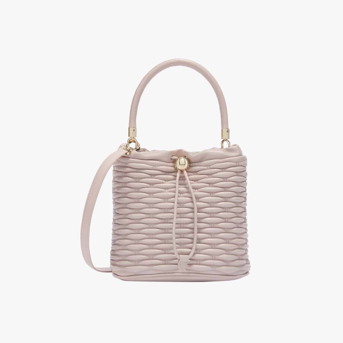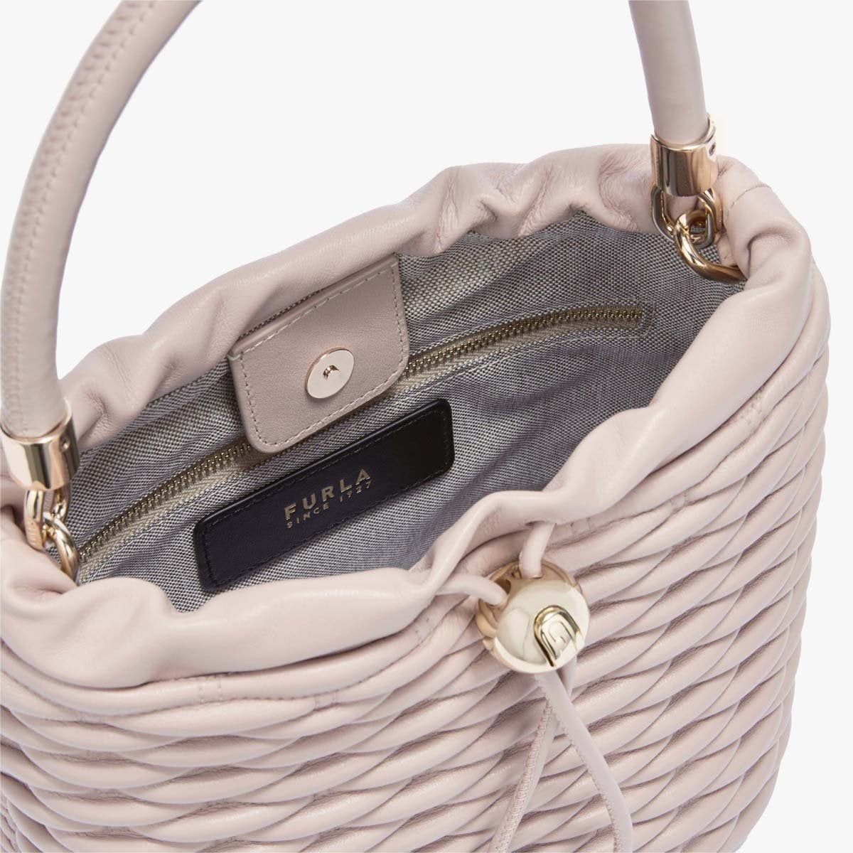 Túi Tote Nữ Furla Mionido Mini mang phong cách hiện đại với chất liệu da chần bông mềm. Thiết kế của túi được lấy cảm hứng từ nghệ thuật thủ công của những chiếc giỏ dệt Midollino. Túi được đóng mở bằng khóa nam châm bên trong, kết hợp phụ kiện logo Furla hình cầu tăng độ thanh lịch và nổi bật.