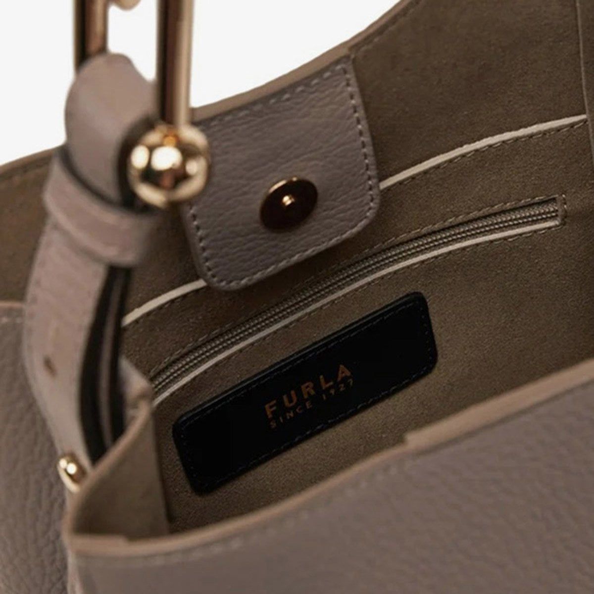 Đơn giản mà tinh tế, Furla Nuvola bucket bag sở hữu những đường nét mềm mại và thanh lịch. Được chế tác từ da vân cao cấp, chất liệu vừa nhẹ vừa mang lại cảm giác sang trọng, túi có kích thước nhỏ gọn, dễ dàng cầm tay hoặc đeo vai nhờ quai xách da có nút điều chỉnh. Điểm nhấn khác biệt nằm ở chi tiết kim loại Arcosfera – sự kết hợp biểu tượng logo Arch đặc trưng cùng họa tiết tròn độc đáo của Furla, tạo nên dấu ấn hiện đại và sang trọng.