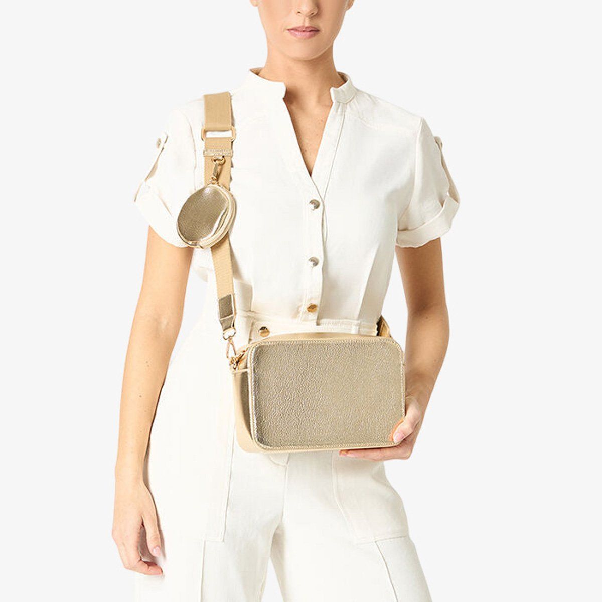 Túi xách nữ PRIMADONNA GOLD UNI - Chiếc túi mini đeo chéo ánh vàng từ bộ sưu tập Xuân-Hè của Primadonna Collection là món phụ kiện thể hiện vẻ đẹp thanh lịch hiện đại pha chút táo bạo. Lớp phủ ánh kim màu vàng rực rỡ thu hút ánh nhìn ngay lập tức, mang đến cảm giác vừa sang trọng vừa trẻ trung và đầy năng động. Cho một buổi tối mùa hè, hãy kết hợp cùng áo blouse trắng và chân váy midi xếp ly chất satin màu kem để hoàn thiện vẻ ngoài cuốn hút.