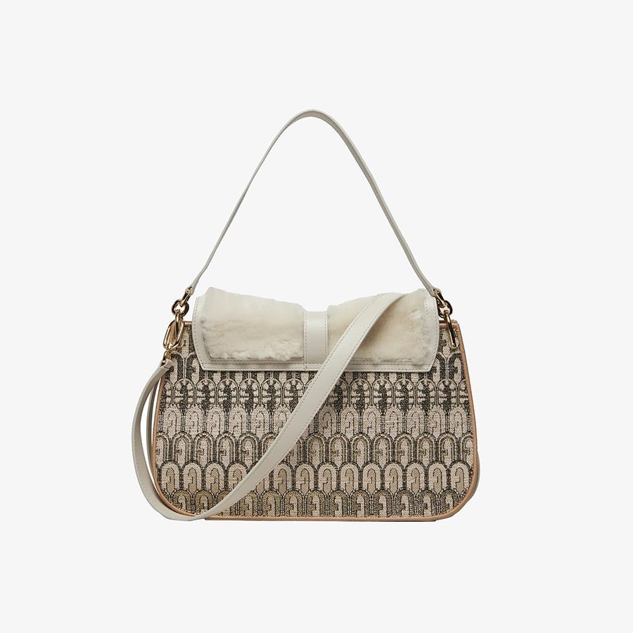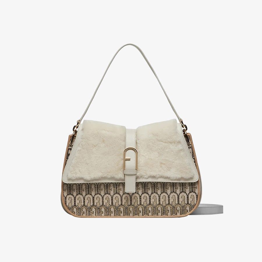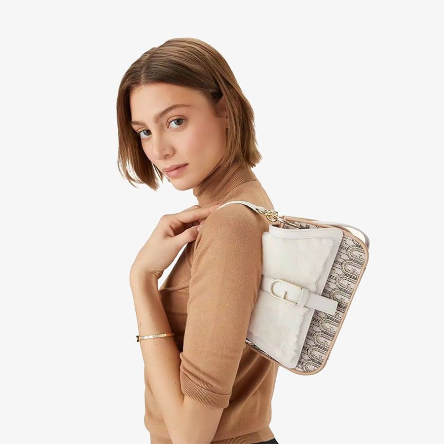 Chiếc túi xách mini Furla Flow độc đáo với chất liệu vải jacquard có họa tiết biểu tượng Arch. Đặc biệt lớp nắp mềm mại từ da cừu. Không gian túi rộng bạn có thể mang theo tất cả những vật dụng cần thiết của mình trong đó, dù là xách bằng tay hoặc sử dụng dây đeo vai hoặc đeo chéo. Khóa nút bấm biểu tượng Arch trên phía trước thêm một phần lấp lánh cho chiếc túi.