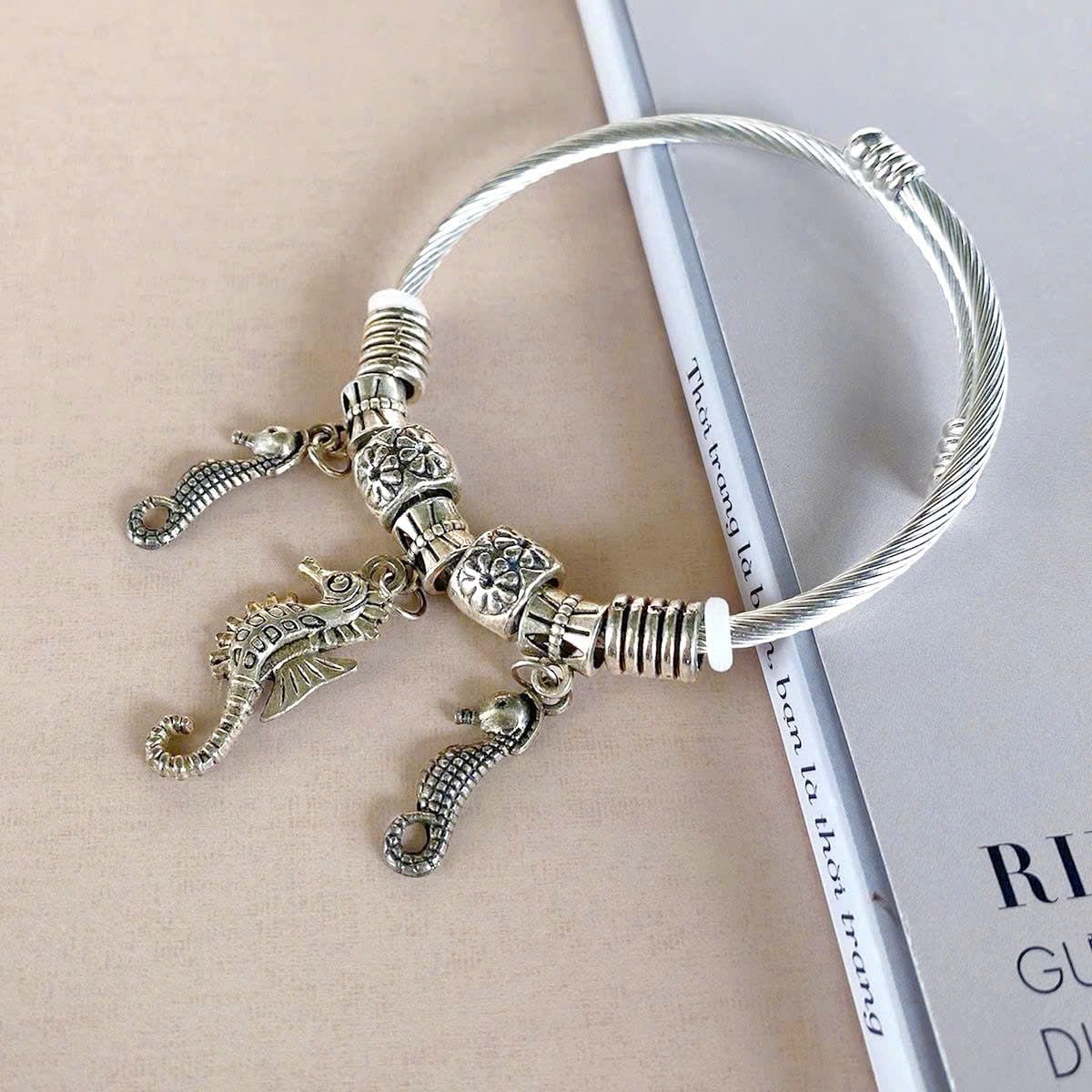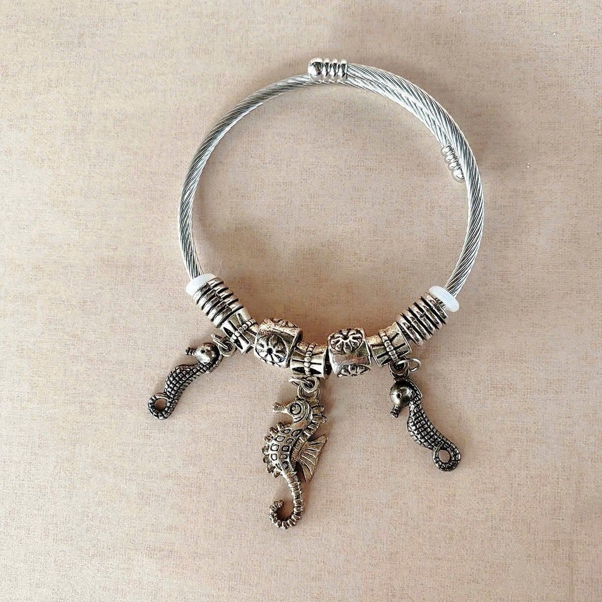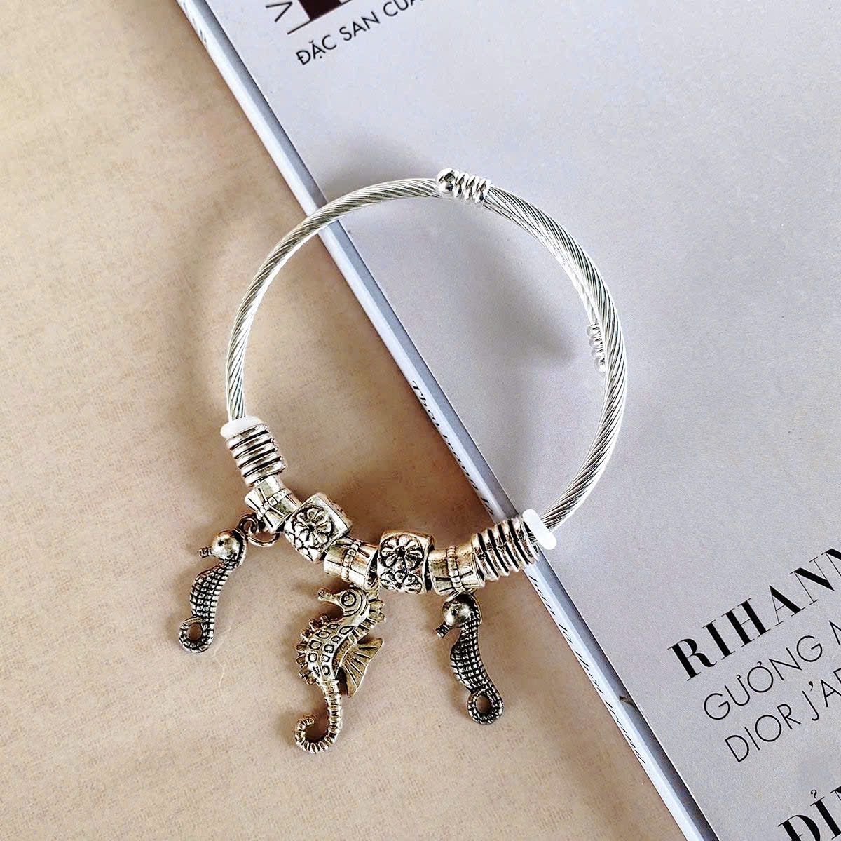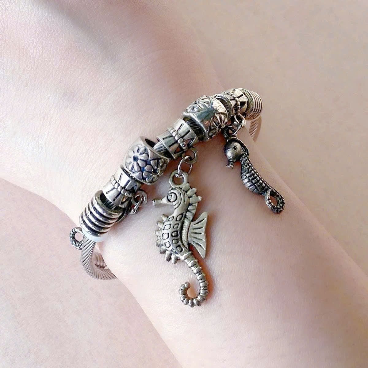 Được thiết kế độc đáo với điểm nhấn là những charm cá ngựa đầy tinh xảo, kết hợp cùng hạt kim loại chạm khắc hoa văn cổ điển. Thiết kế vòng lò xo tiện lợi, dễ dàng điều chỉnh, ôm vừa vặn cổ tay mà vẫn tạo cảm giác thoải mái.
